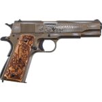 The (45 ACP, 5″) 2021 Bootlegger Special Edition has custom wood grips, engraved with depictions from the 1920’s, finished in distressed Burnt Bronze cerakote with printing on the slide and clear coat. It comes with one 7 round magazine. Driftable rear sights and a firing pin block.
