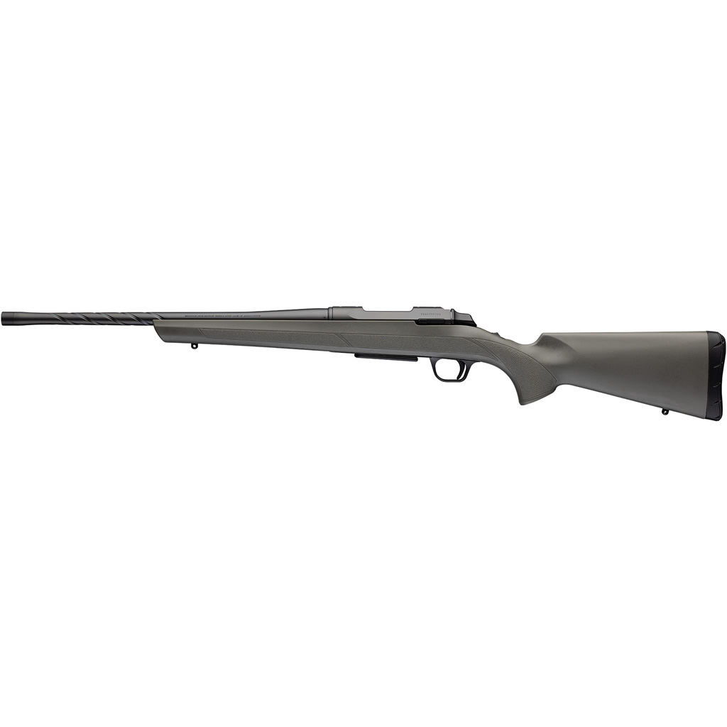 Versatile hunting rifle with spiral fluted barrel and bolt body. Gray/green composite stock. Shorter barrel lengths optimized for suppressor use. Detachable box magazine. Two-piece bolt handle.