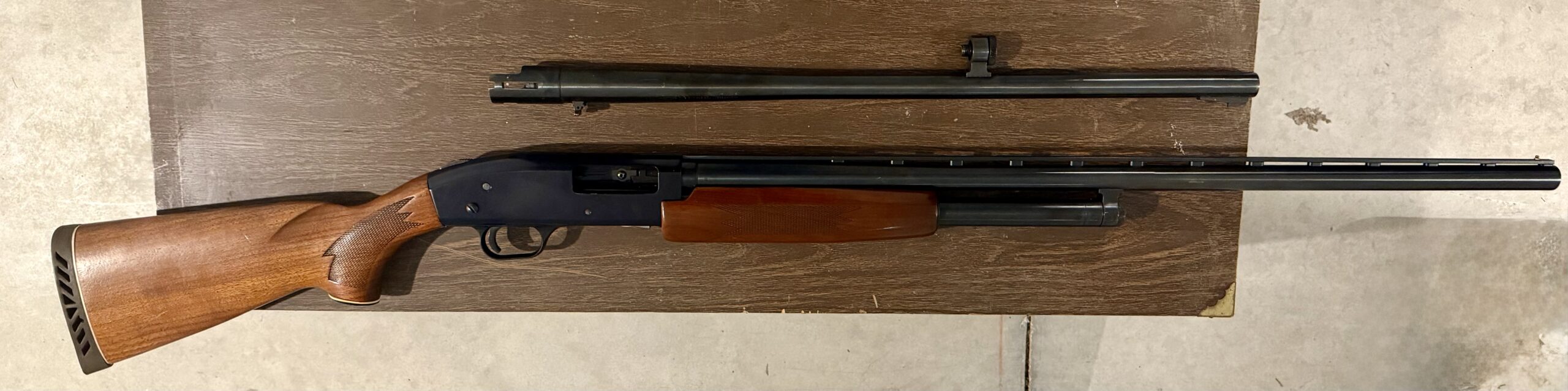 The 28-inch barrel is suited for general field use, while the 24-inch barrel is configured for deer hunting, allowing quick adaptation between smoothbore and rifled applications depending on the setup. The wood stock provides a traditional appearance and a stable platform, and the steel receiver contributes to overall durability. The pump-action mechanism is manually cycled to chamber rounds from the magazine, and the shotgun maintains the standard five-shot capacity typical of the 500 line.