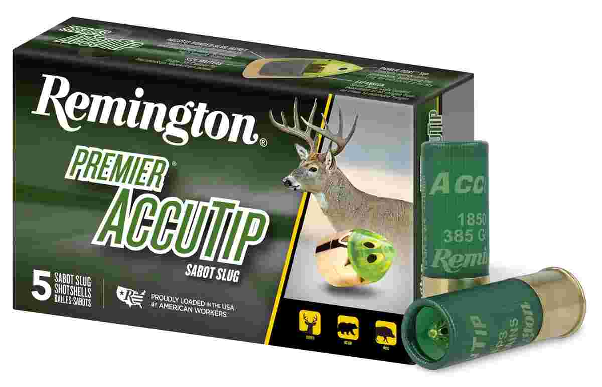 Guided by Power Port Tip, Remington’s Premier AccuTip Sabot Slug delivers a degree of accuracy and terminal performance unmatched by any other. This masterpiece of aerodynamics consistently prints tiny 100-yard groups and transfers tremendous knockdown force to the farthest reaches of shotgun range. It’s the largest tipped slug you’ll find anywhere. This slug is designed for rifled barrels only.