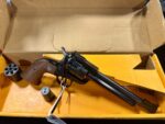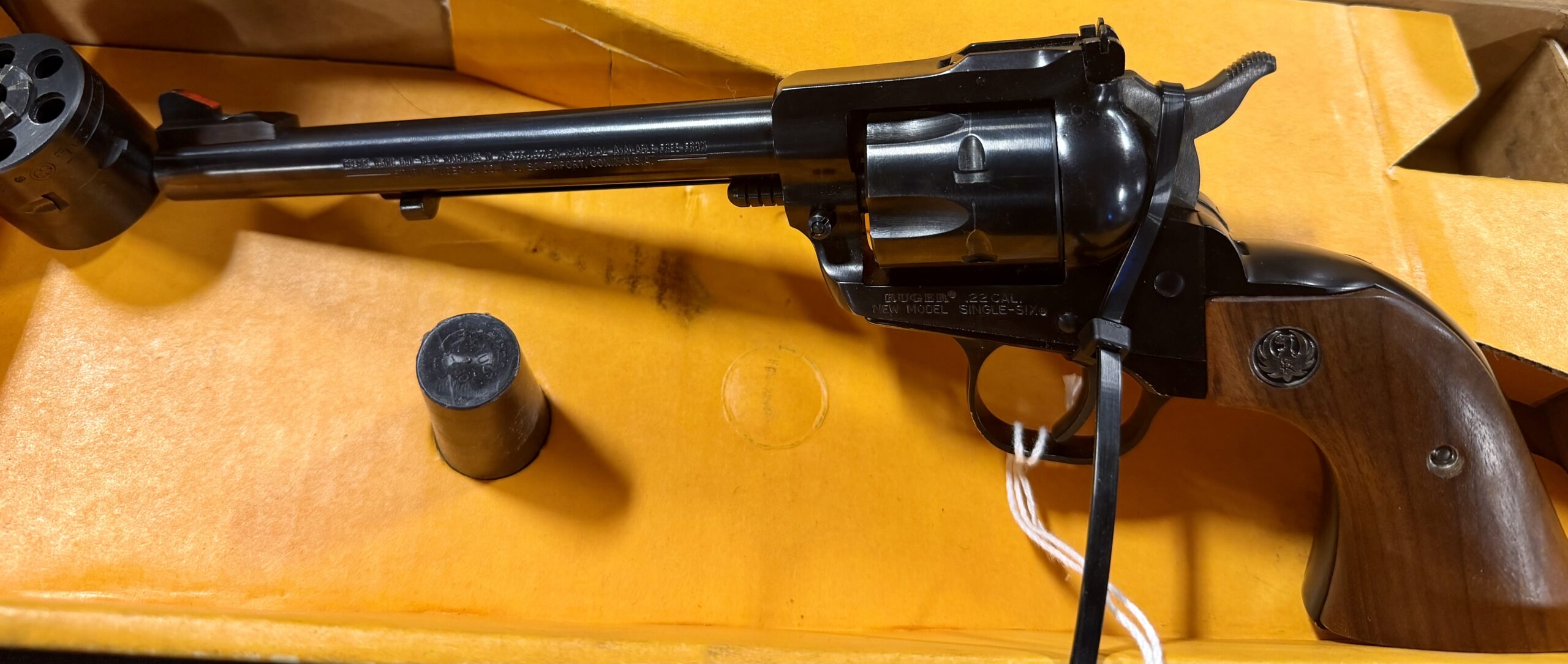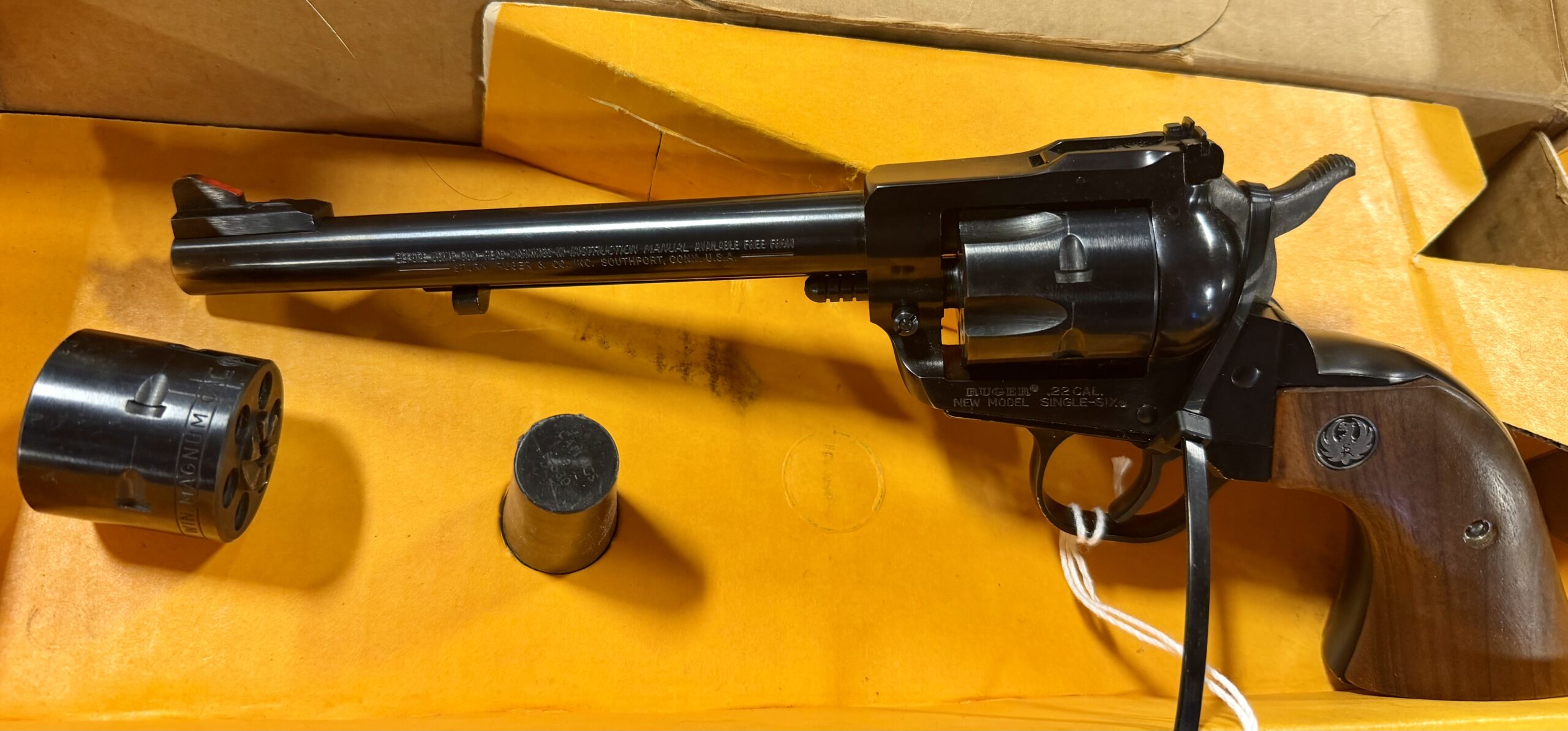 Ruger, Single-Six Convertible, Single Action, Revolver, 22LR/22 WMR, 5.5″ Barrel, Alloy Steel, Blued Finish, Checkered Walnut Grips, Adjustable Rear & Ramp Front Sight, 6 Rounds. 22WMR cylinder included with original box! Very minimal use. Revolver looks new!